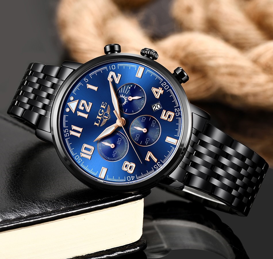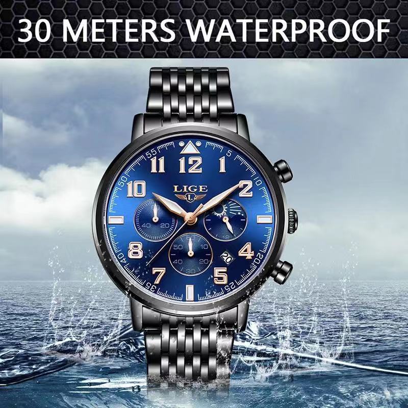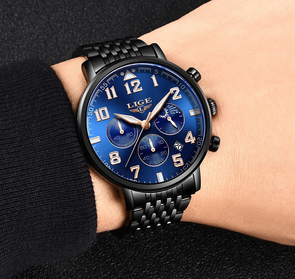 Brand Name : LIGE Model no : 9879A Dial diameter : 40 mm Dial thikness : 8.5 mm Bracelet width : 18mm Watch Circumference : 22cm Movment :Quartz,auto date Chronograph Strap material: Stainless steel Waterproof : 30 meters , Glass : Sapphire Crystal Weight : 105gm , Colour :Black golden , Original