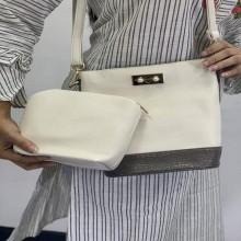 Item: Hand Bag ( 2 piece bag set) Color - White with snake print Size - 9" (Height), 7" (Width) Mini bag 6"/6" Long belt is available inside the bag
